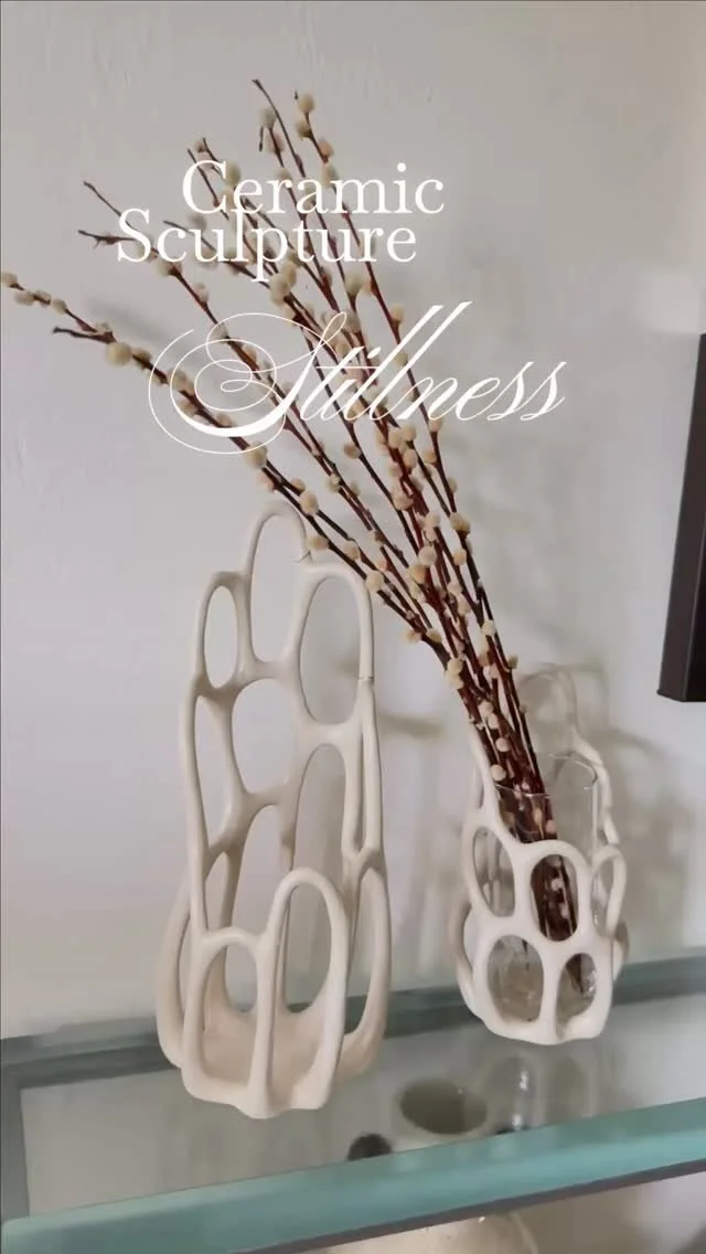 This compact work introduces a softened presence through its subtle blue-toned glaze. The open structure allows light to pass through gently, casting delicate shadows that shift throughout the day.