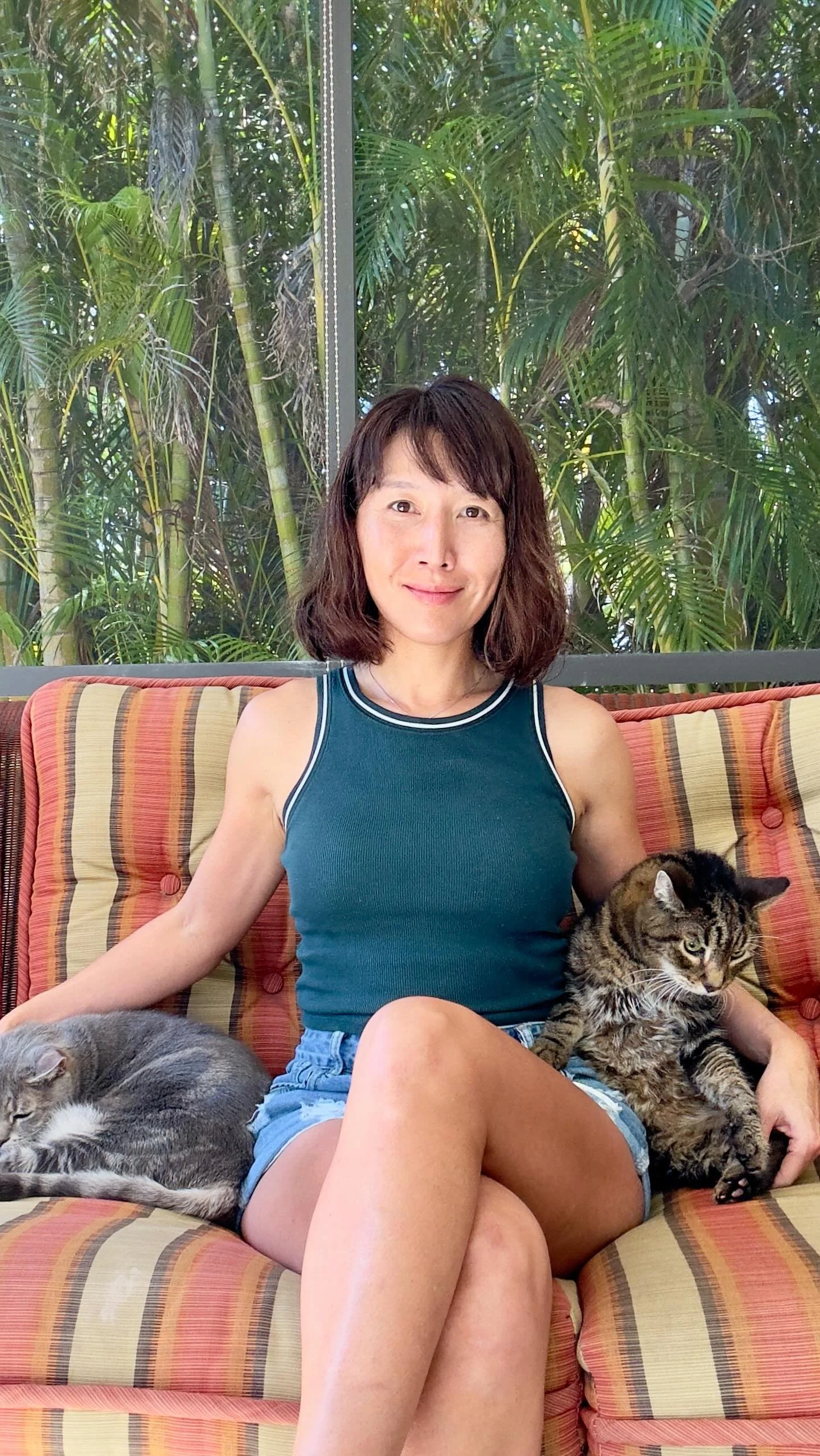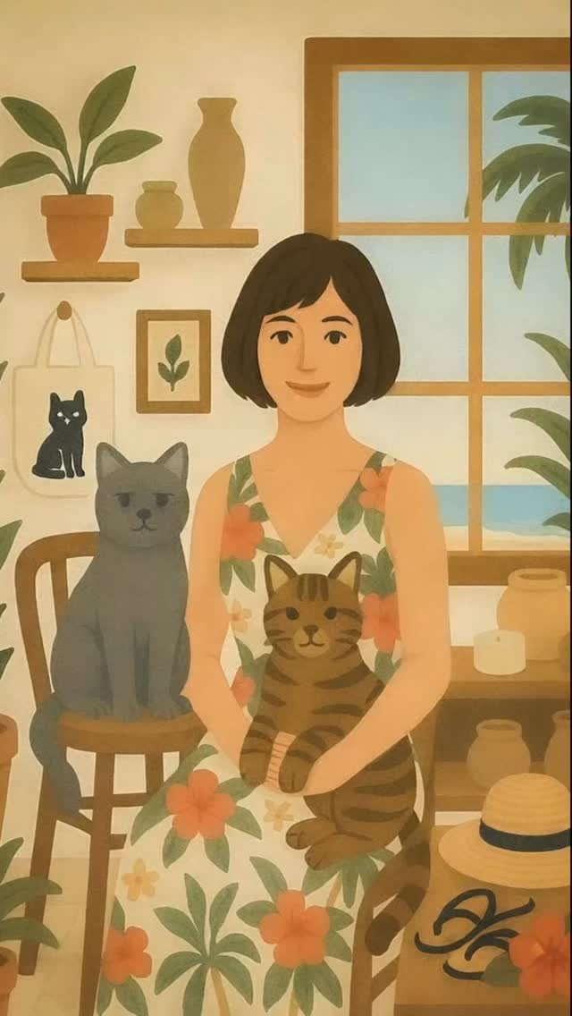 実店舗はありませんが、心の中ではいつも、フロリダ州ネイプルスの海辺の小さな路地にたたずむお店を思い描いています。ヤシの木とトロピカルな花々に囲まれた店先では、ふたりの猫が気ままに看板猫として過ごしています。